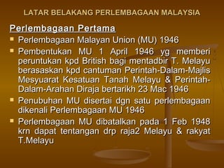 Proses Perkembangan Sistem PemerintahanMalayan Union1946Tentangan Malayan UnionPersekutuan Tanah Melayu1948Pilihan Raya pertama1955Kemerdekaan. 5Latar belakang Perlembagaan Persekutuan 1957 a Perjanjian Persekutuan Tanah Melayu 1948 - Selepas Perang Dunia Kedua Malayan Unionditubuhkan oleh British di Tanha Melayu. PERLEMBAGAAN MALAYSIA DAN HUBUNGAN ETNIK 2.